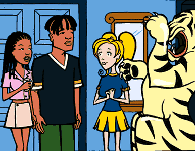 (Kevin's voice from inside the tiger) "HELP!!!! I was getting Brittany's pom pom out of here for her when my shoulder pads got stuck....help.....guys?? Anybody??" -